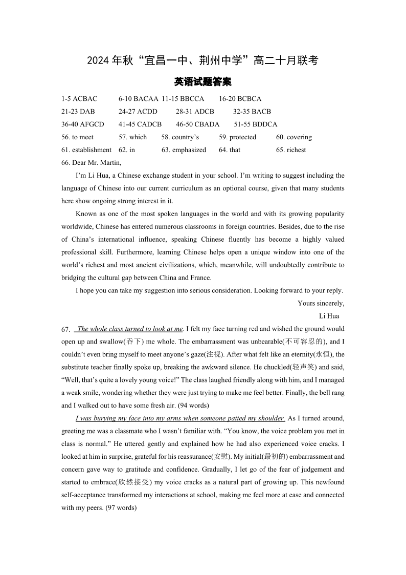 湖北省2024 年秋“宜昌一中、荆州中学”高二十月联考 英语答案