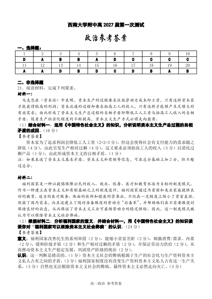 西南大学附中高2027届高一上定时检测(一) 政治答案