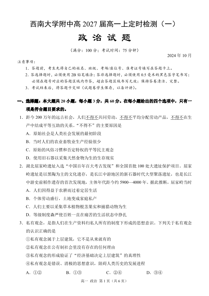 西南大学附中高2027届高一上定时检测(一) 政治