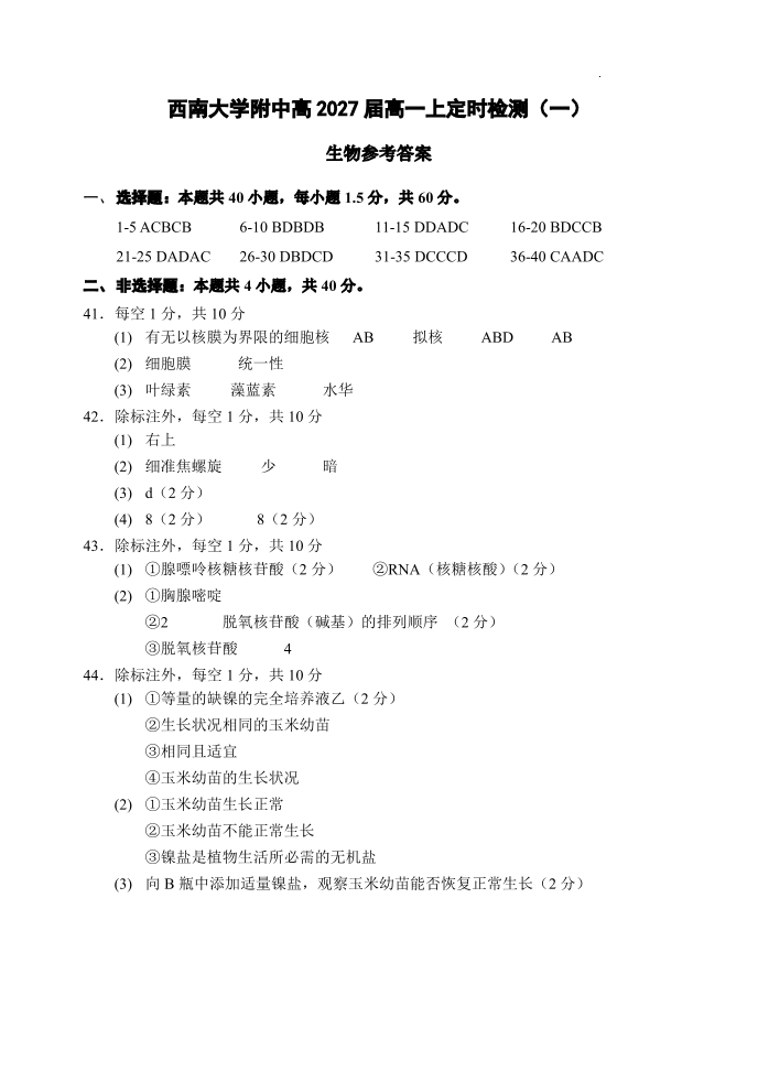西南大学附中高2027届高一上定时检测(一) 生物答案