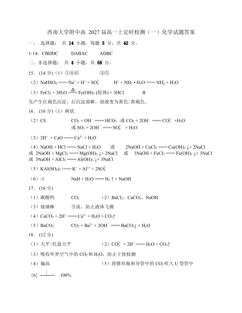 西南大学附中高2027届高一上定时检测(一) 化学答案