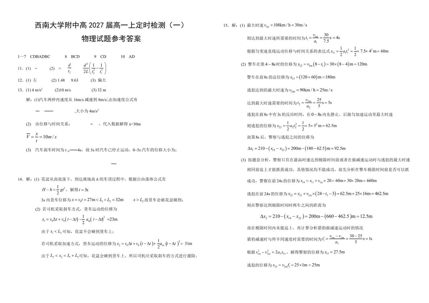 西南大学附中高2027届高一上定时检测(一) 物理答案