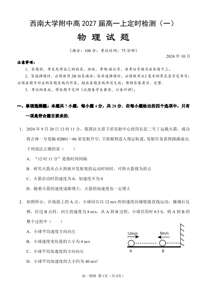 西南大学附中高2027届高一上定时检测(一) 物理