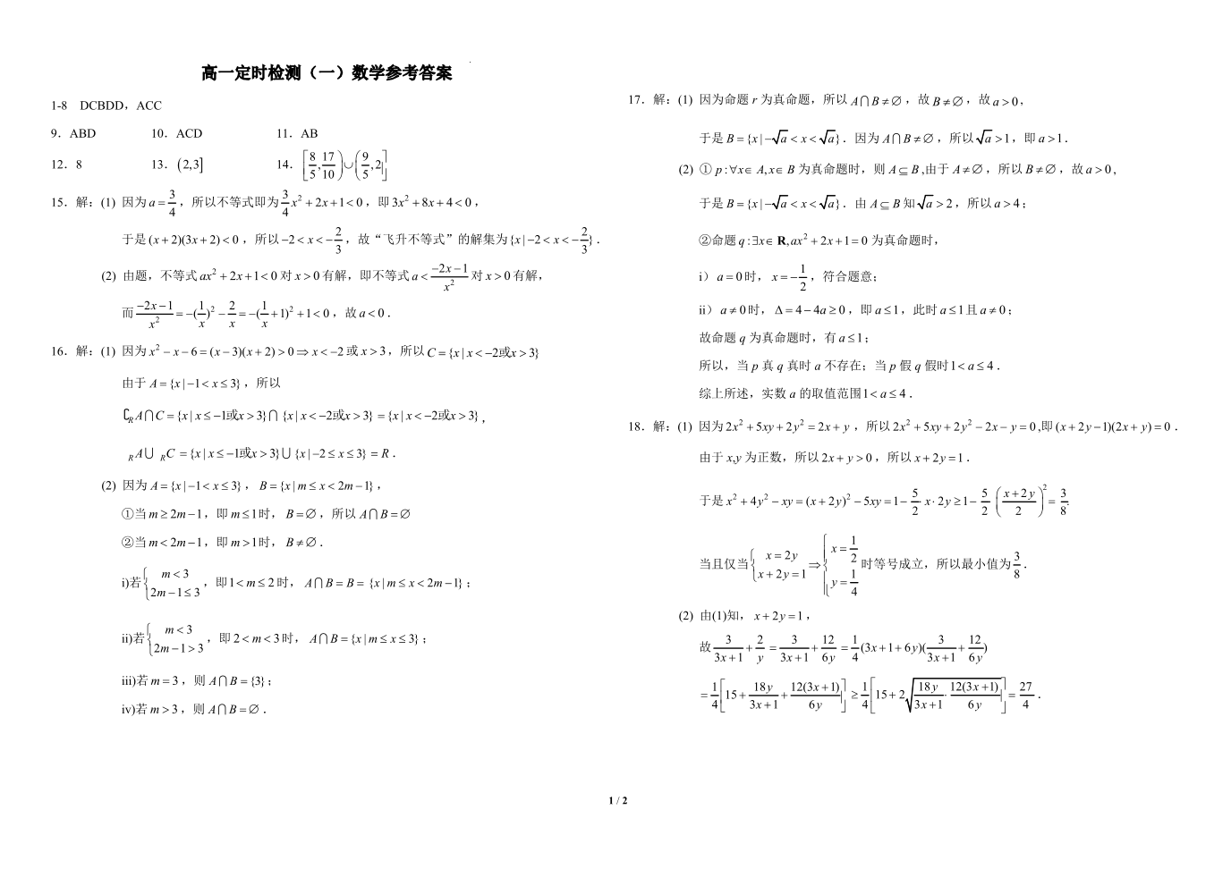 西南大学附中高2027届高一上定时检测(一) 数学答案