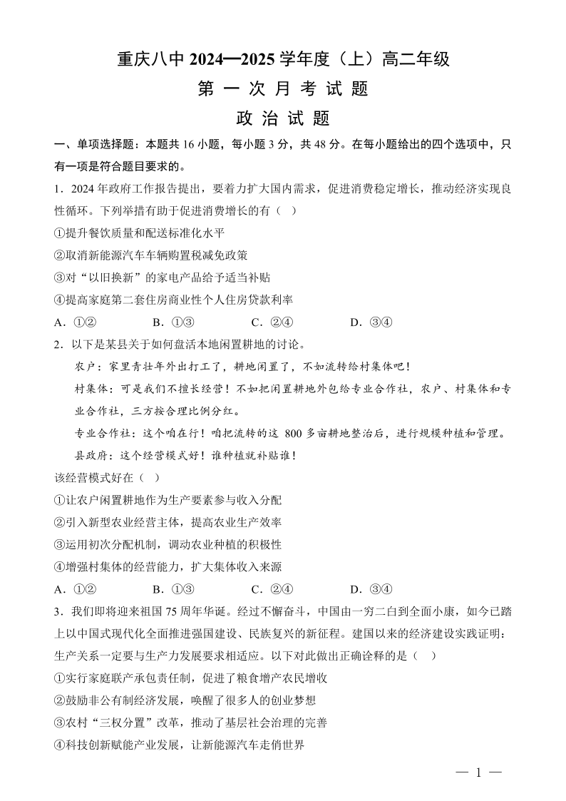 重庆八中2024-2025学年度(上)高二年级第一次月考 政治