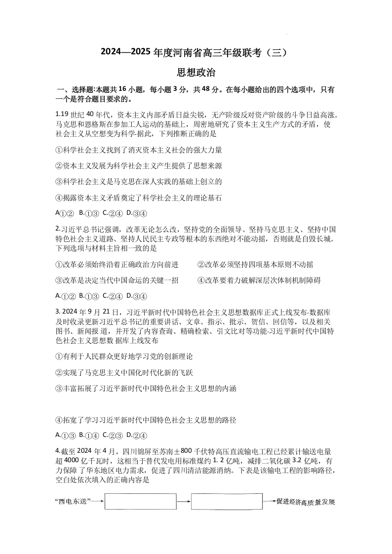 河南省2024-2025年度高三年级联考(三)政治