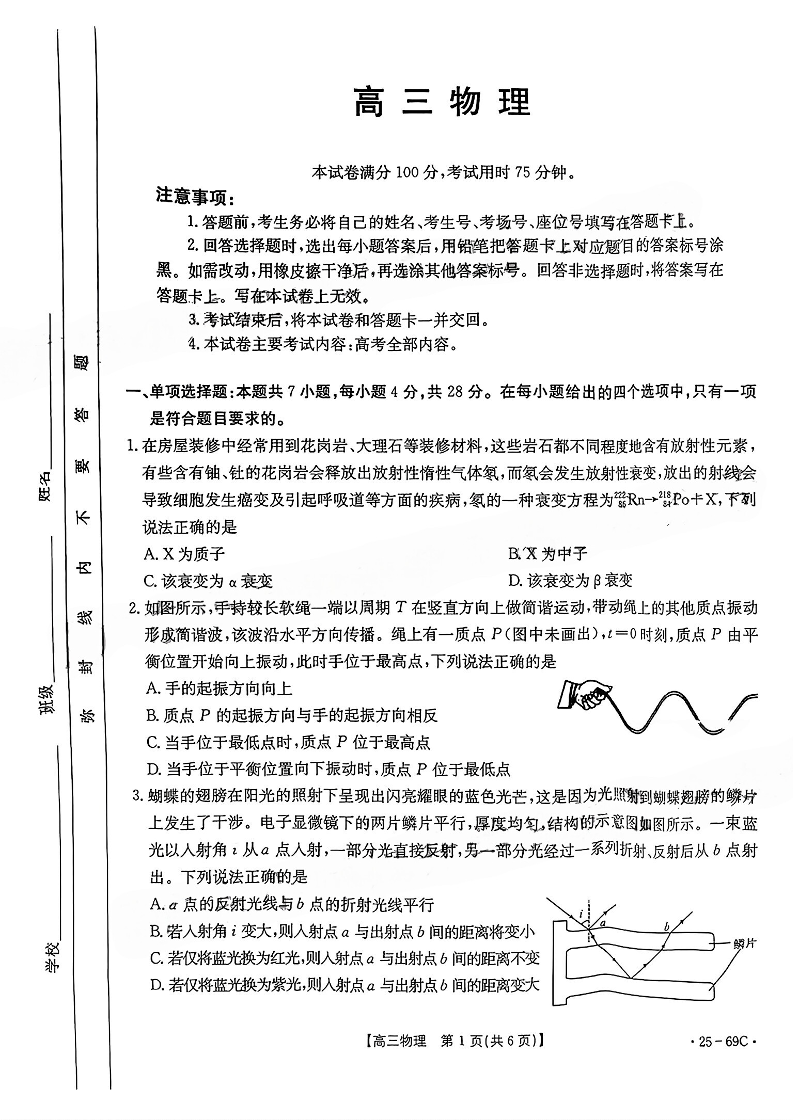 广东省部分学校2025届高三10月联考 物理