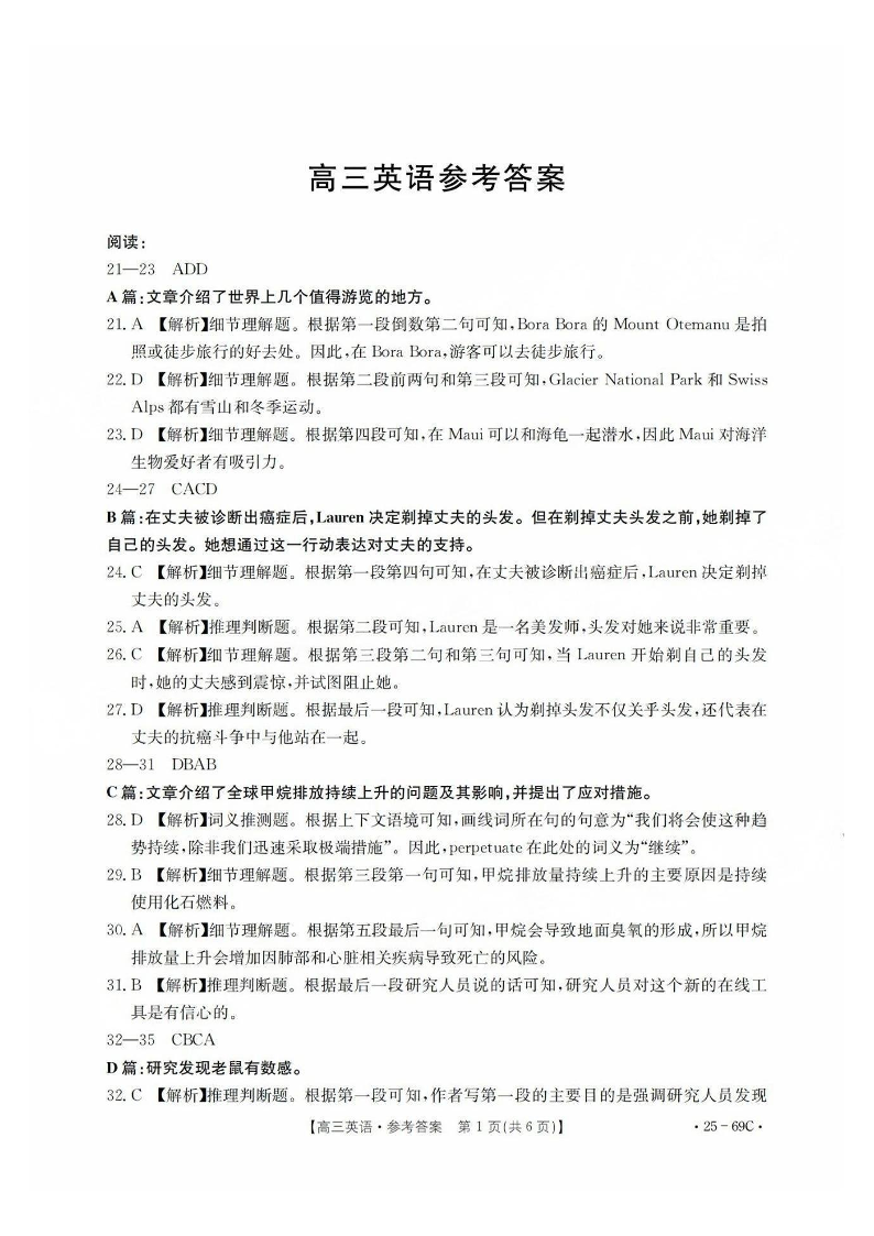 广东省部分学校2025届高三10月联考 英语答案