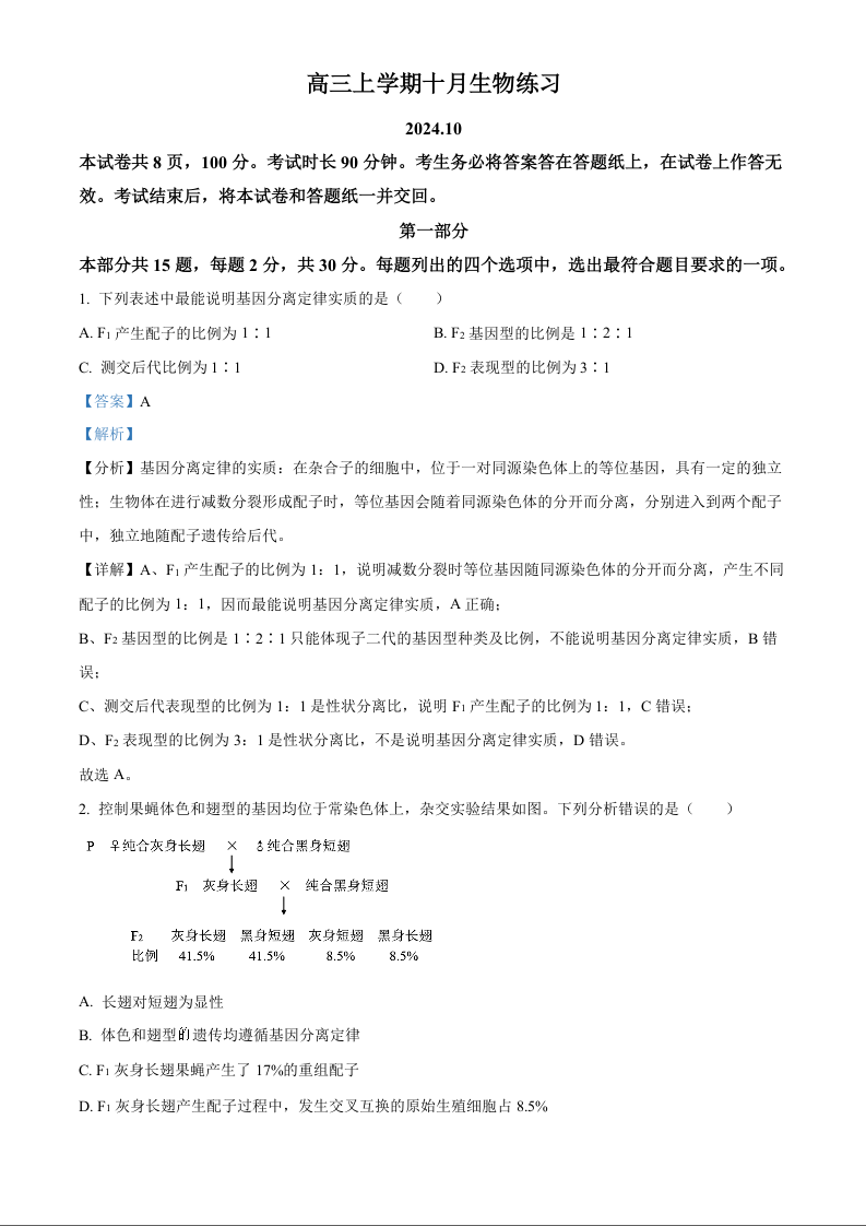 北京市海淀区2024-2025学年度第一学期10月份阶段练习 生物答案