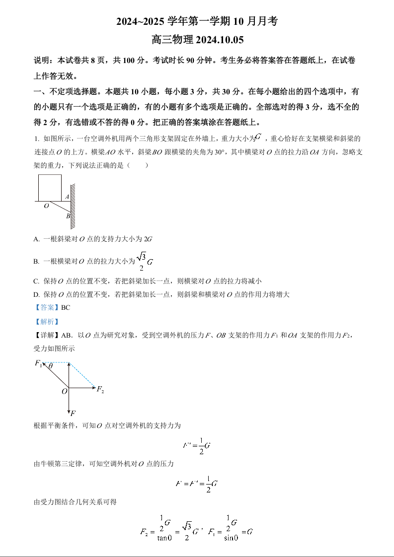 北京市海淀区2024-2025学年度第一学期10月份阶段练习 物理答案