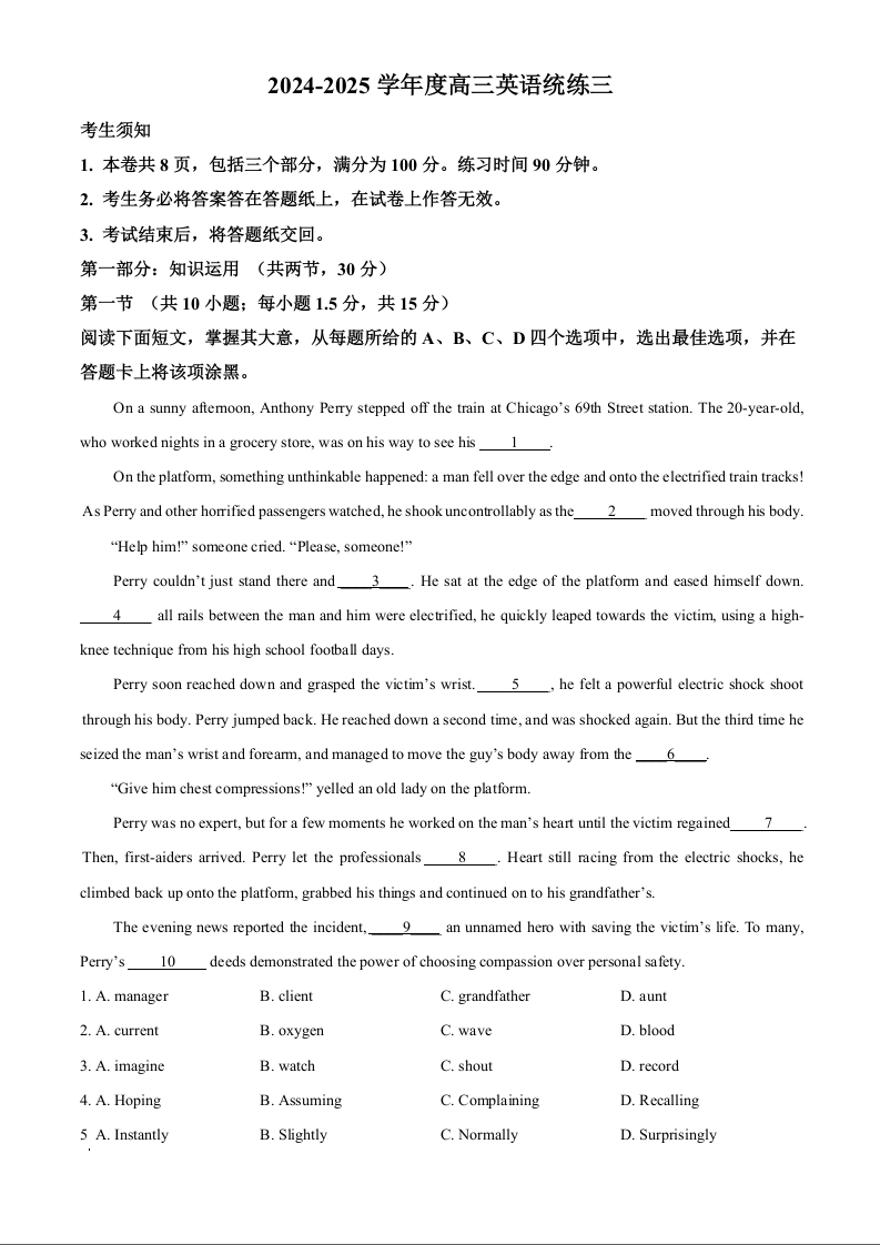 北京市海淀区2024-2025学年度第一学期10月份阶段练习 英语