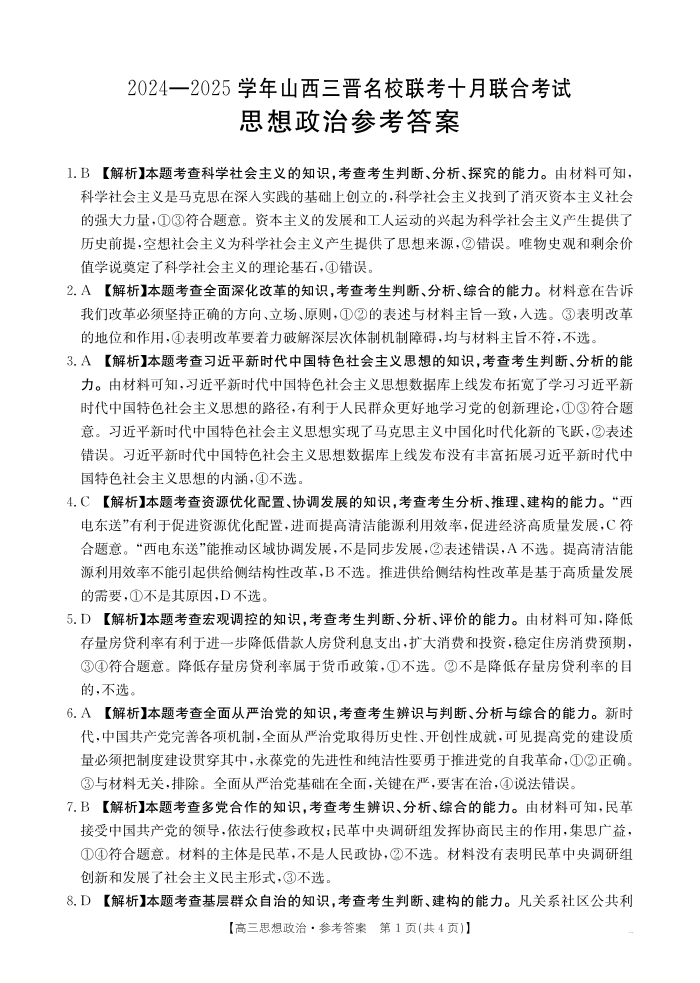 山西省三晋名校2024-2025学年高三上学期10月联考 政治答案