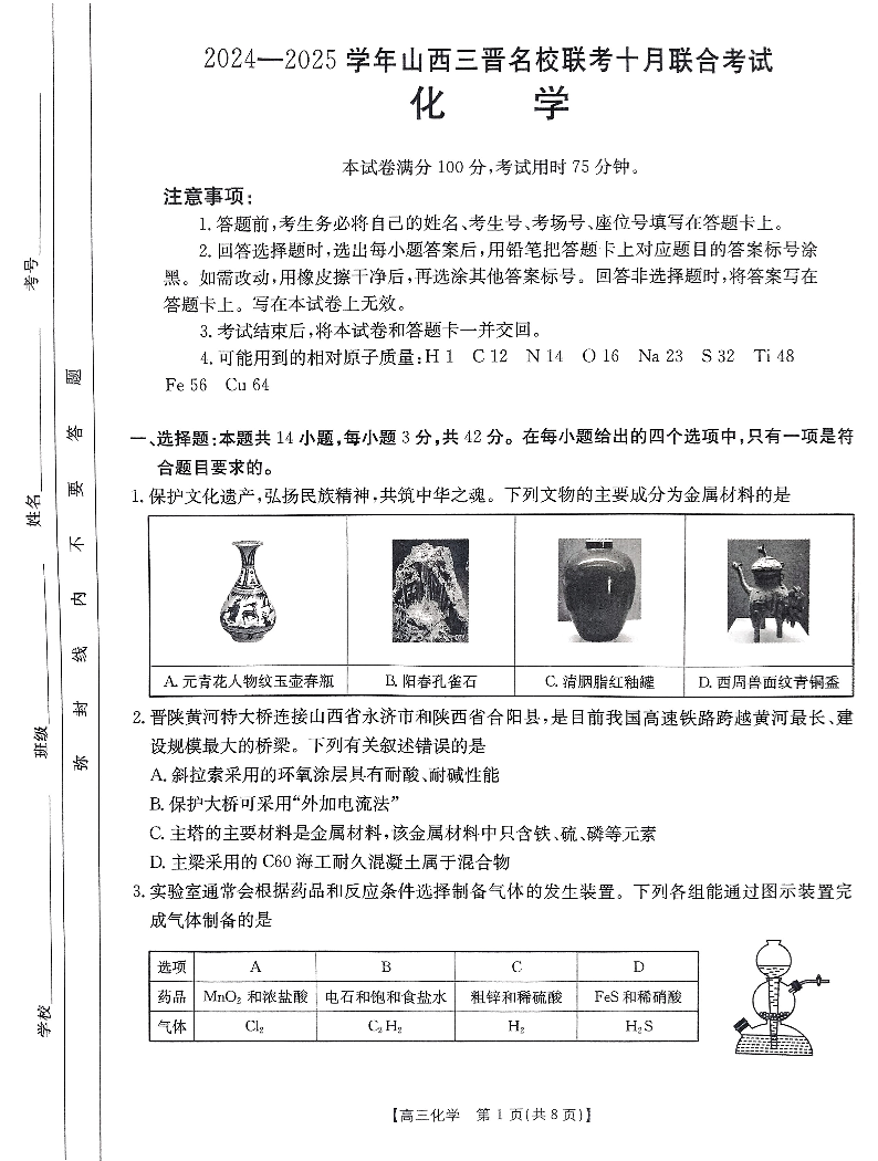 山西省三晋名校2024-2025学年高三上学期10月联考 化学