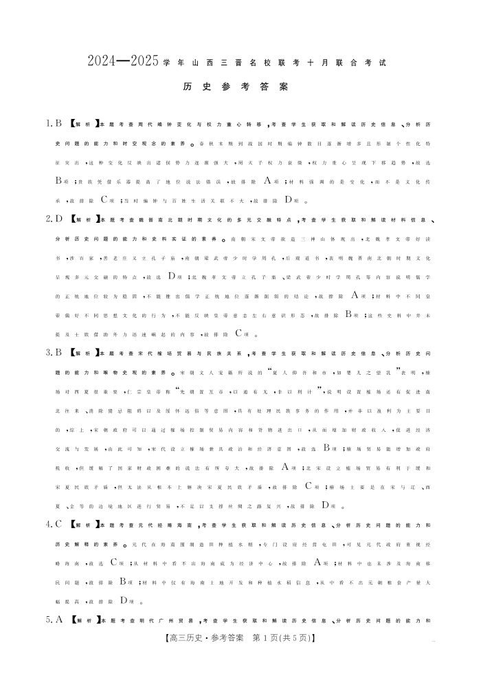 山西省三晋名校2024-2025学年高三上学期10月联考 历史答案