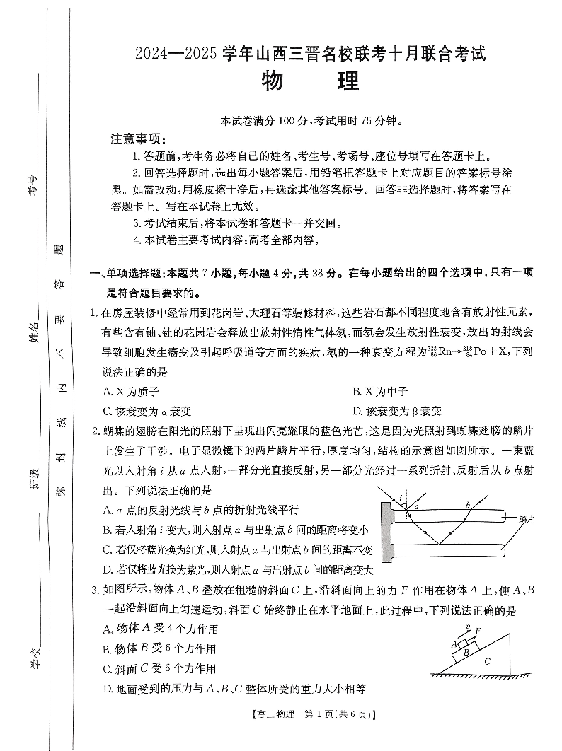 山西省三晋名校2024-2025学年高三上学期10月联考 物理