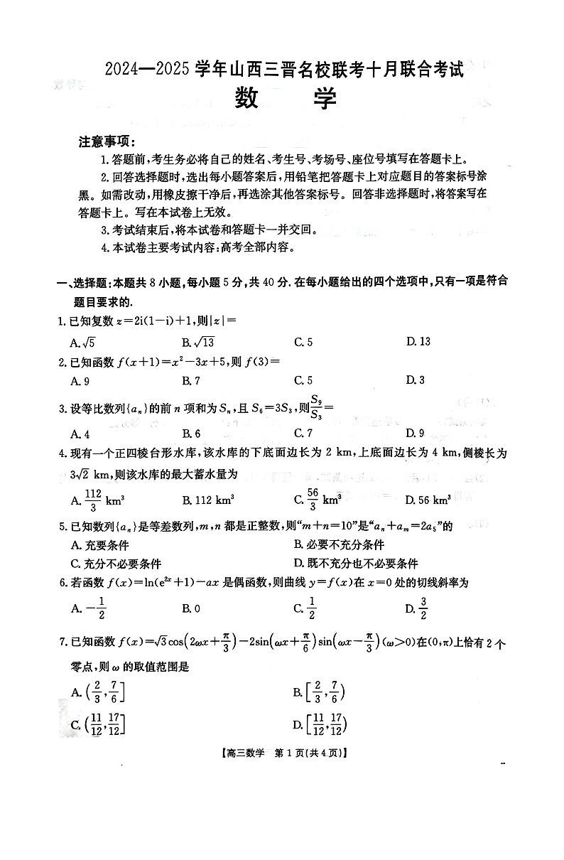 山西省三晋名校2024-2025学年高三上学期10月联考 数学