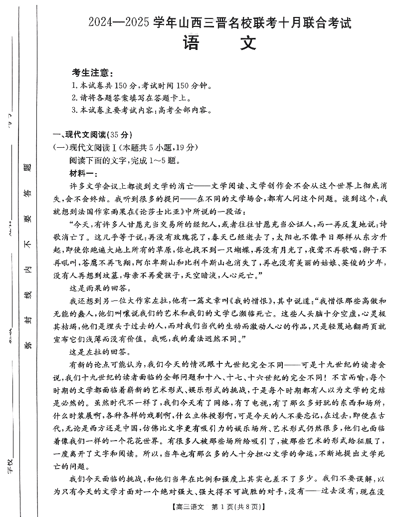 山西省三晋名校2024-2025学年高三上学期10月联考 语文