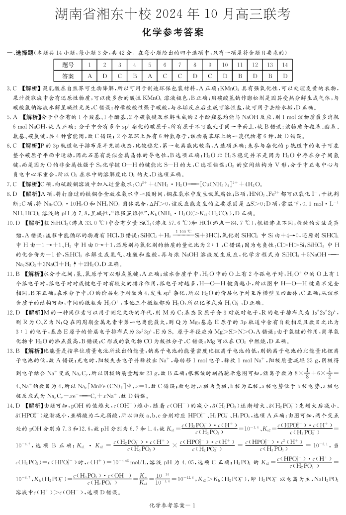 湖南省湘东十校2024年10月高三联考 化学答案