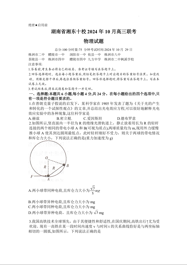 湖南省湘东十校2024年10月高三联考 物理