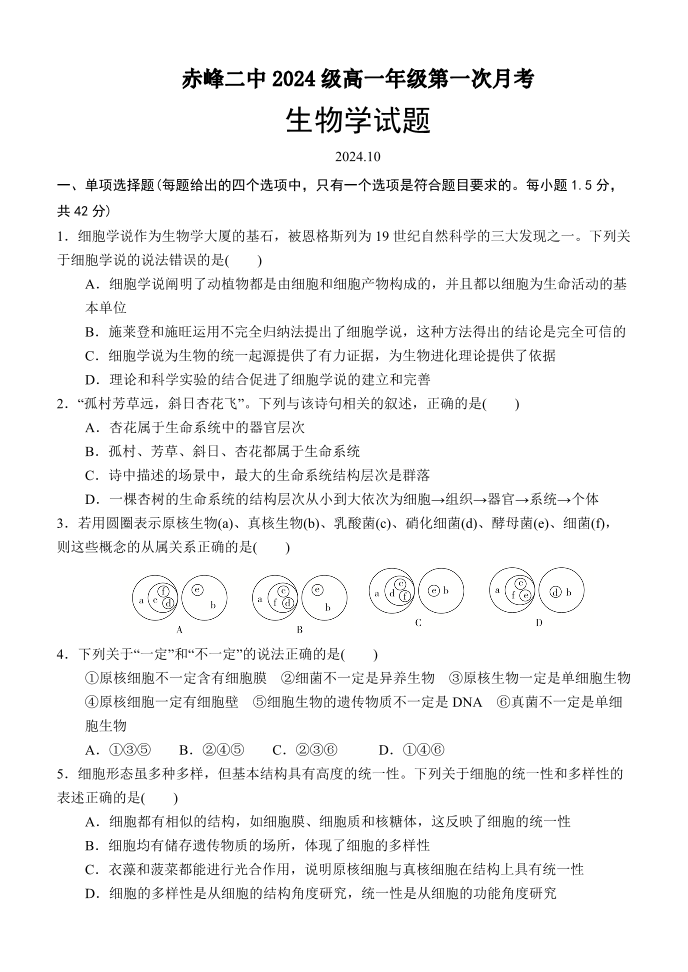 内蒙古赤峰二中2024-2025学年高一上学期第一次月考 生物