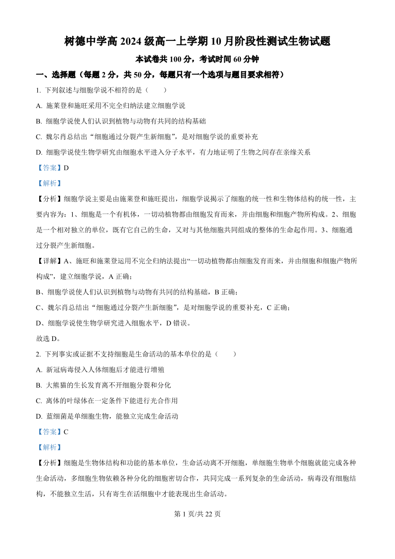 四川省树德中学高2024级高一上学期10月阶段性测试 生物答案