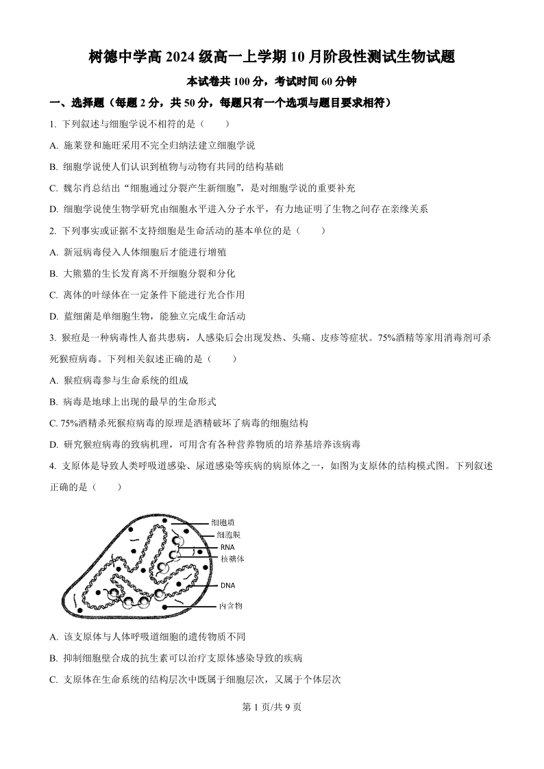 四川省树德中学高2024级高一上学期10月阶段性测试 生物