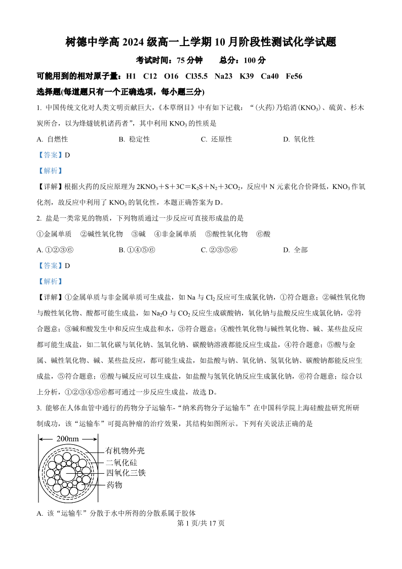 四川省树德中学高2024级高一上学期10月阶段性测试 化学答案
