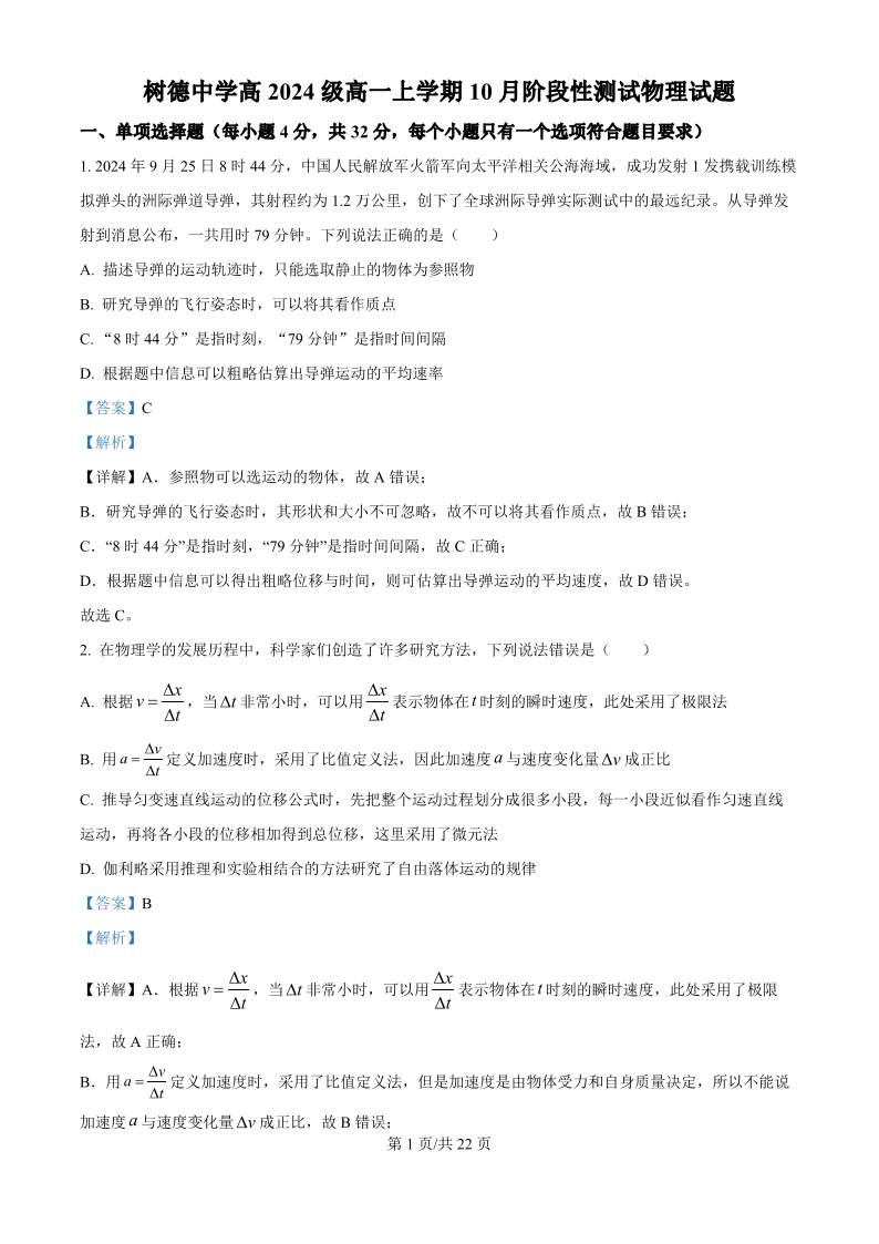 四川省树德中学高2024级高一上学期10月阶段性测试 物理答案
