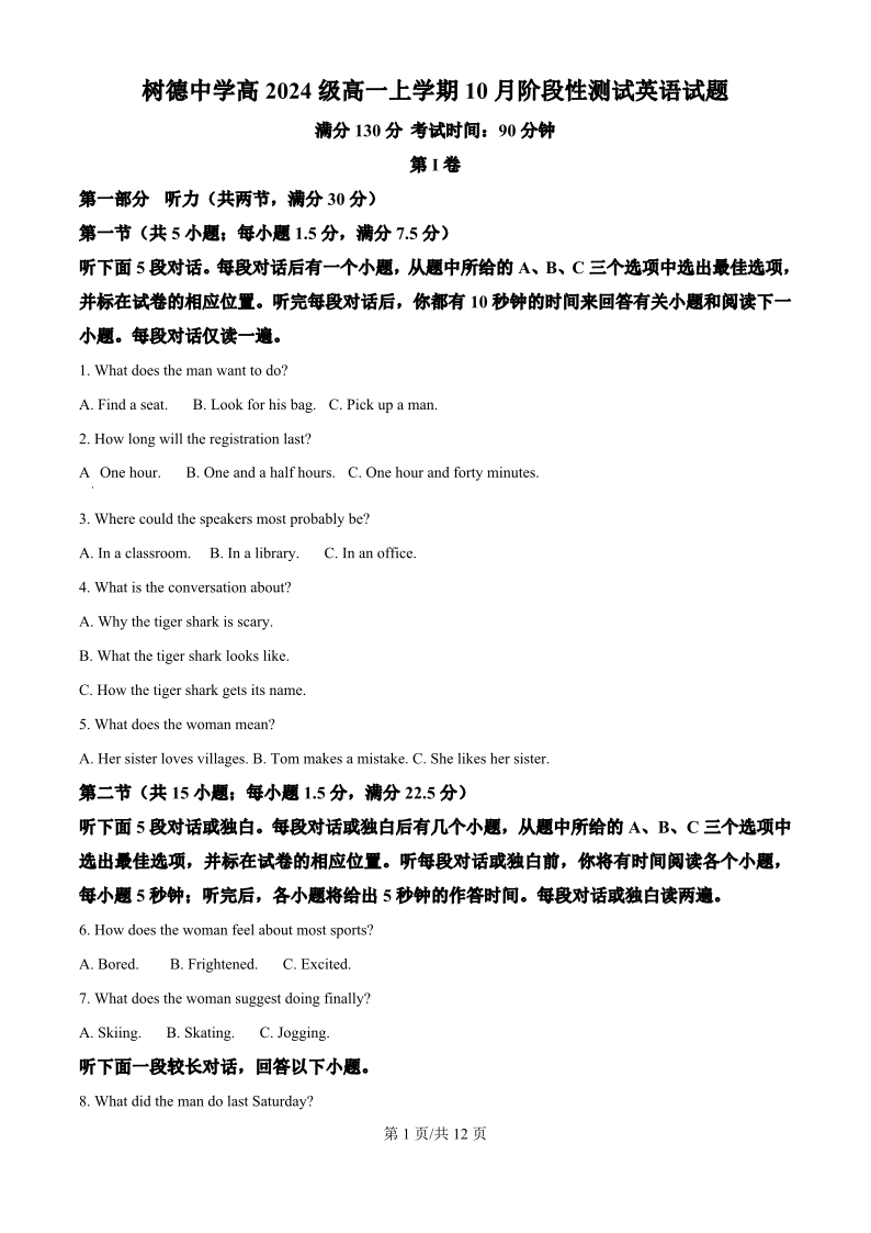 四川省树德中学高2024级高一上学期10月阶段性测试 英语