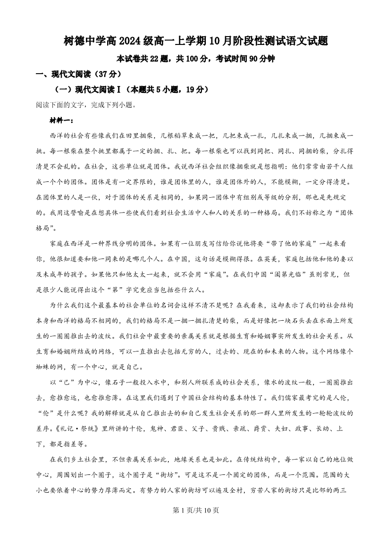 四川省树德中学高2024级高一上学期10月阶段性测试 语文