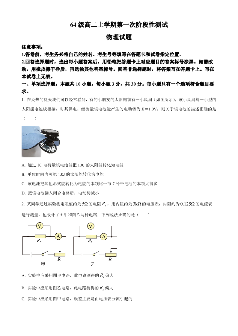 山东省济南市莱芜第一中学2024-2025学年高二上学期第一次阶段性测试 物理