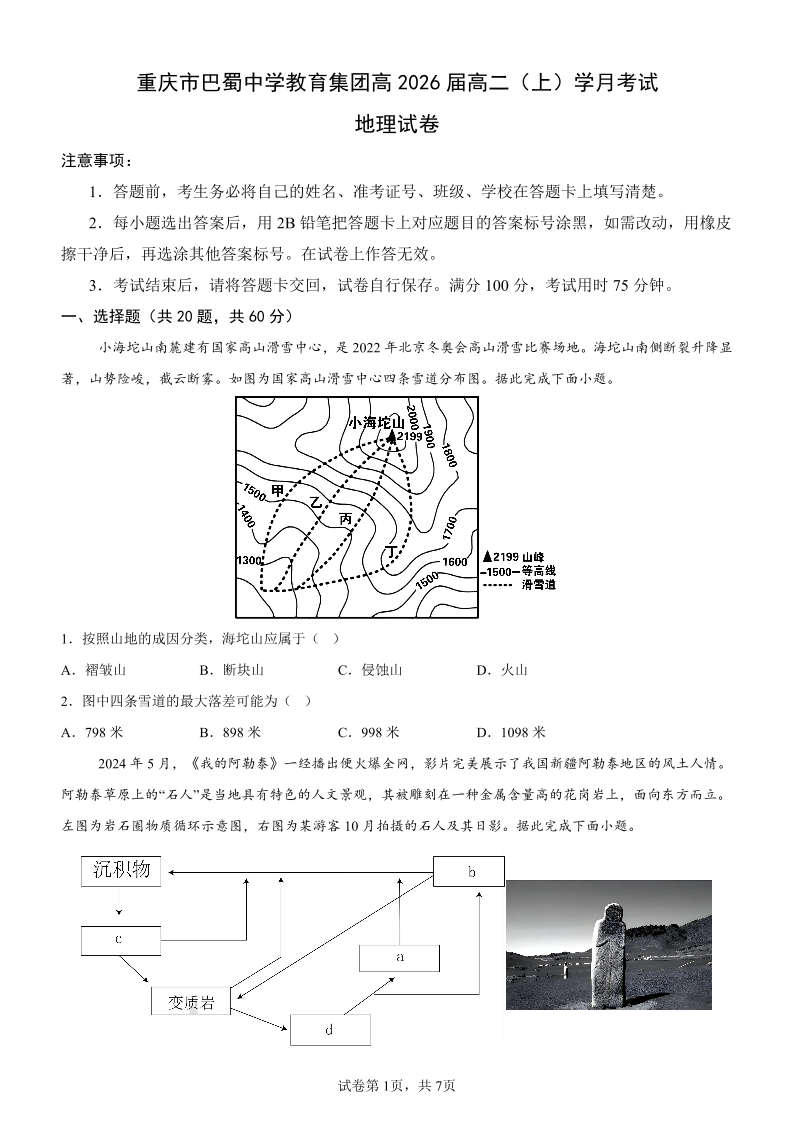 重庆市巴蜀中学教育集团高2026 届高二(上)学月考试 地理