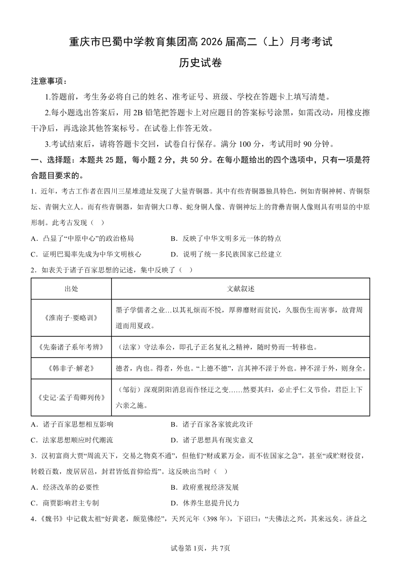 重庆市巴蜀中学教育集团高2026 届高二(上)学月考试 历史