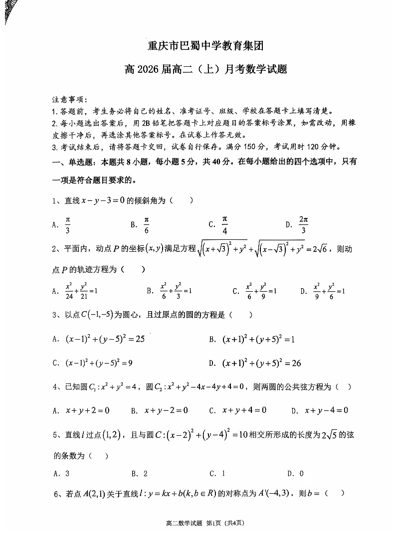 重庆市巴蜀中学教育集团高2026 届高二(上)学月考试 数学