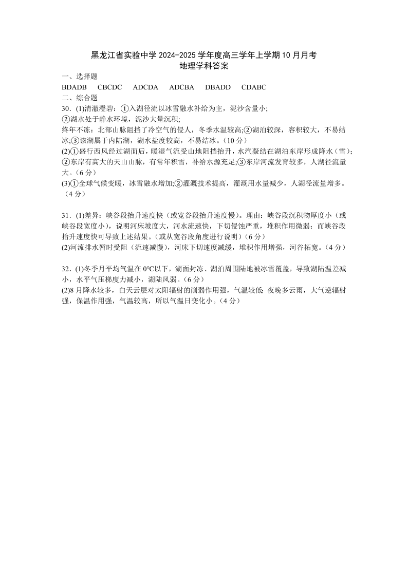 黑龙江省实验中学2024-2025学年高三上学期10月月考 地理答案
