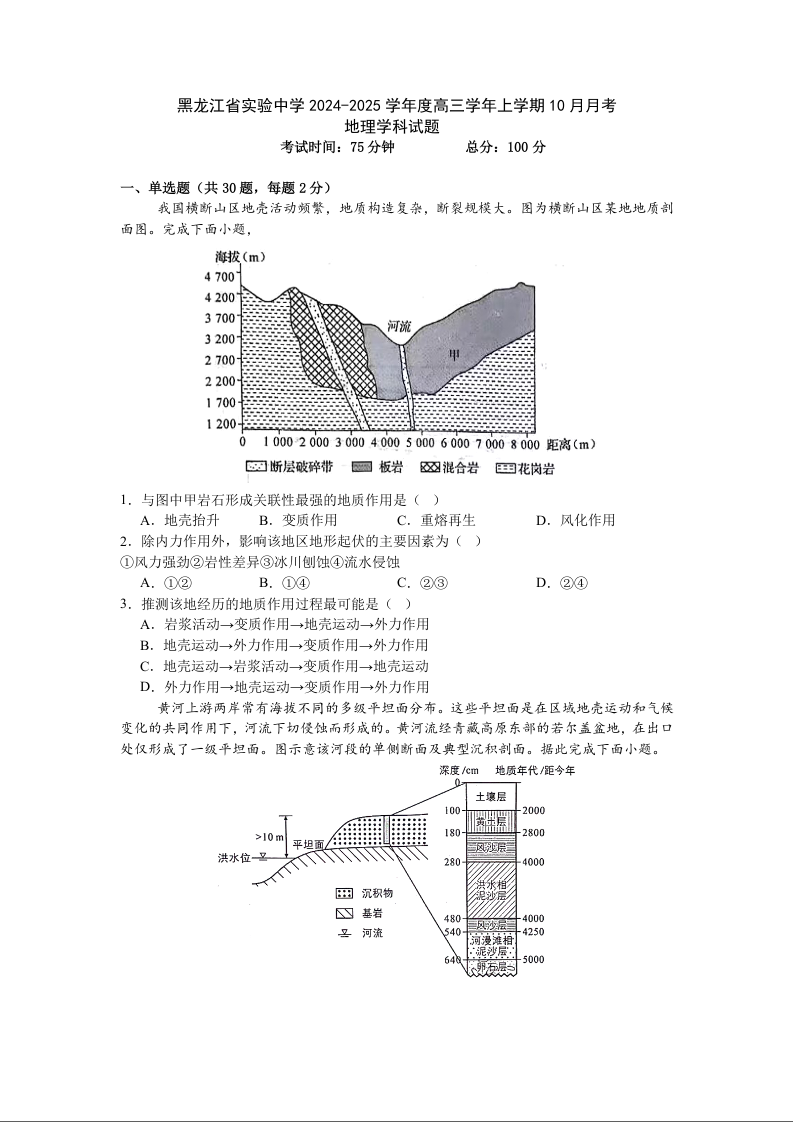 黑龙江省实验中学2024-2025学年高三上学期10月月考 地理
