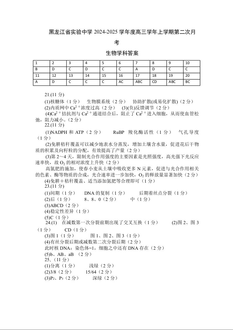 黑龙江省实验中学2024-2025学年高三上学期10月月考 生物答案