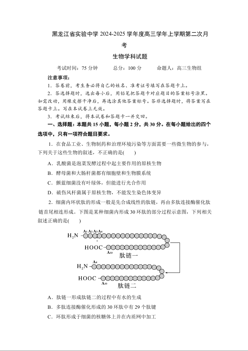 黑龙江省实验中学2024-2025学年高三上学期10月月考 生物