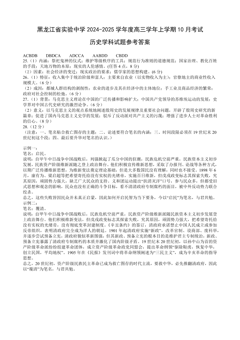 黑龙江省实验中学2024-2025学年高三上学期10月月考 历史答案