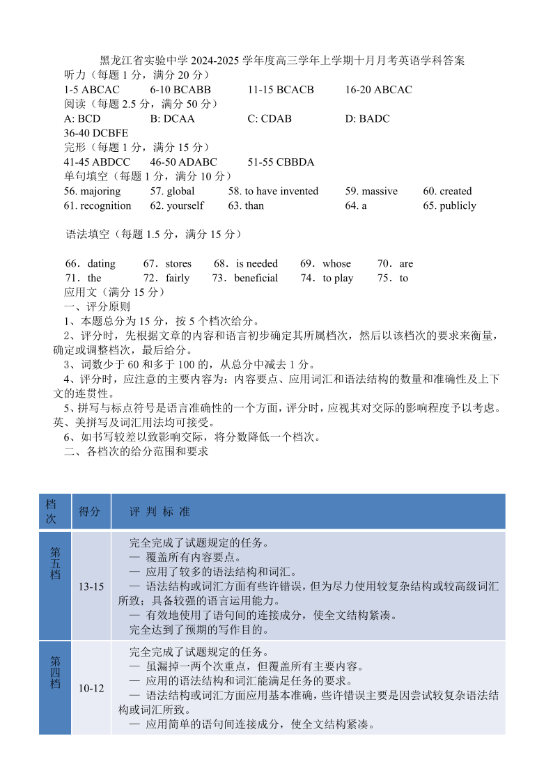 黑龙江省实验中学2024-2025学年高三上学期10月月考 英语答案