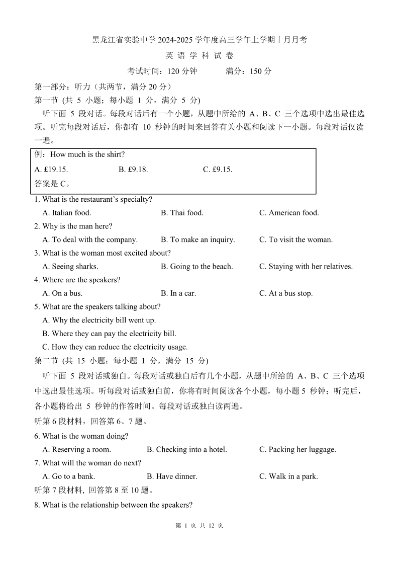 黑龙江省实验中学2024-2025学年高三上学期10月月考 英语