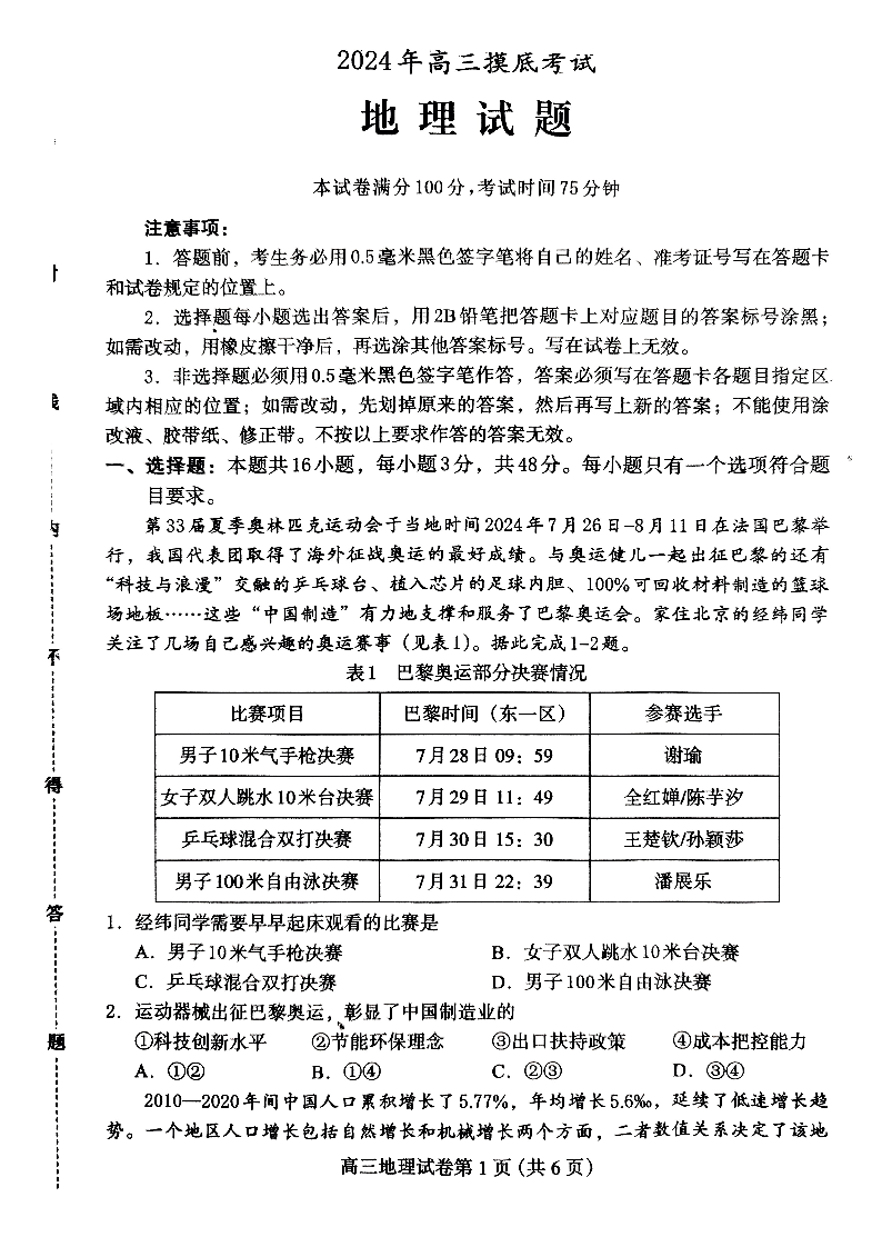 河北省保定市2025届高三摸底考试(保定一模)地理
