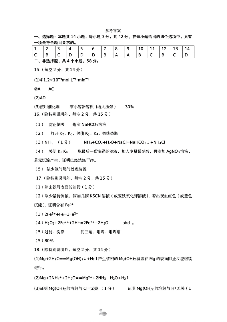河北省保定市2025届高三摸底考试(保定一模)化学答案