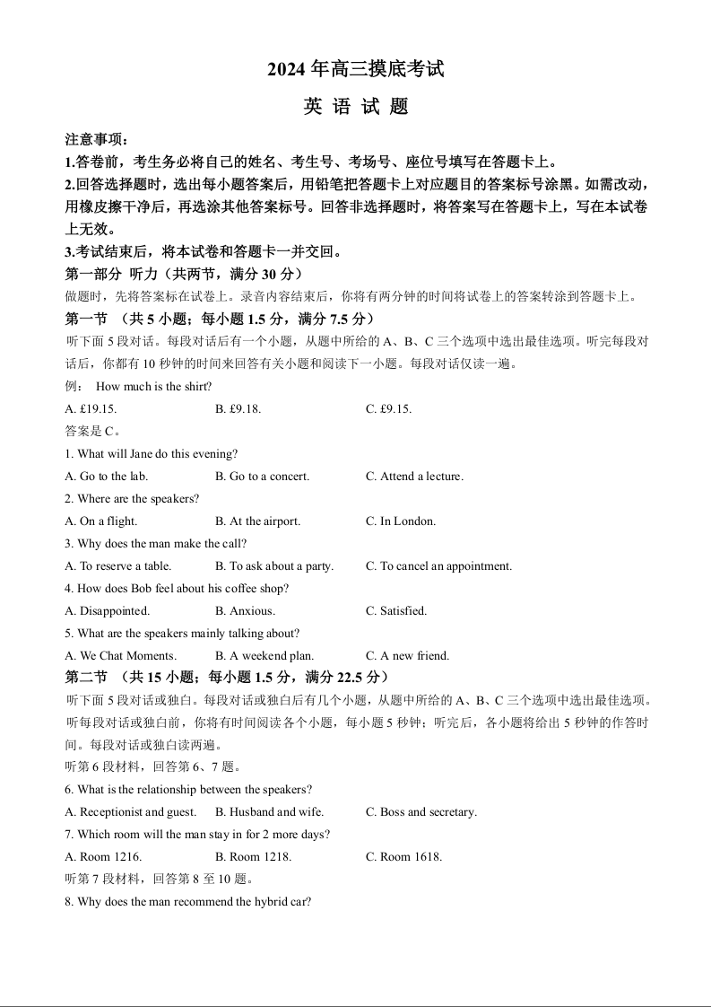 河北省保定市2025届高三摸底考试(保定一模)英语