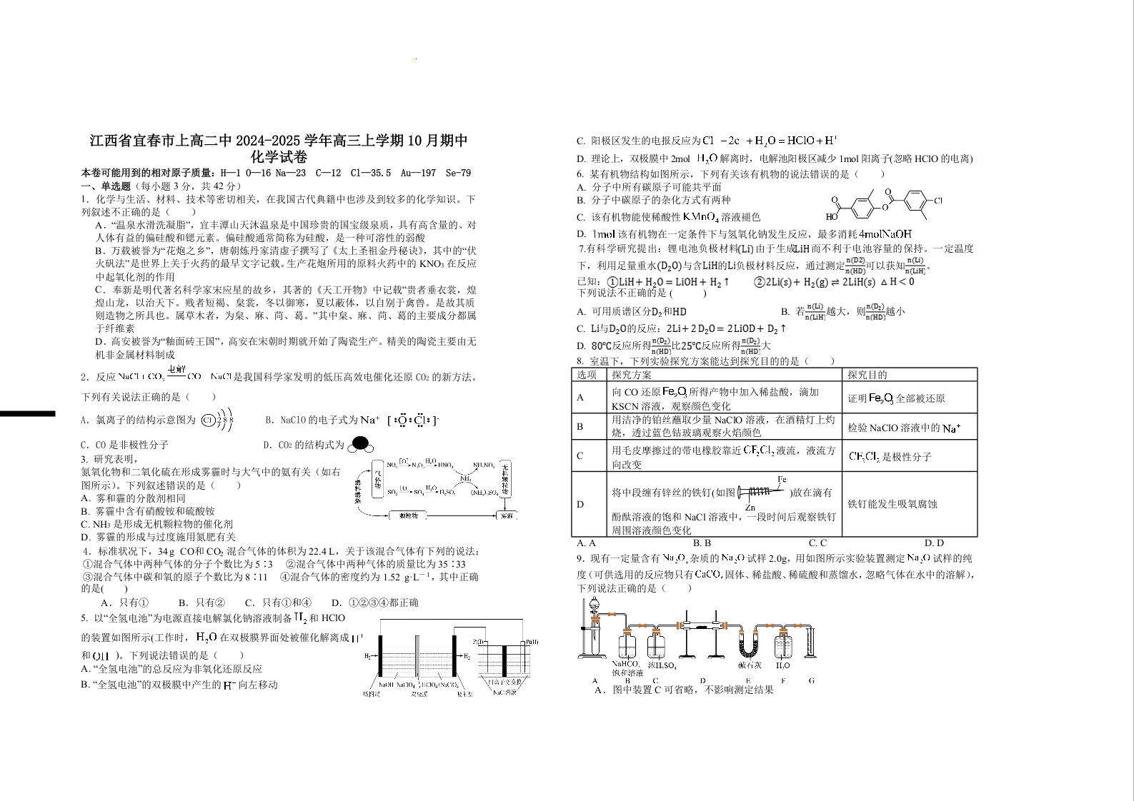 江西省宜春市上高二中2025届高三上学期10月期中考试 化学