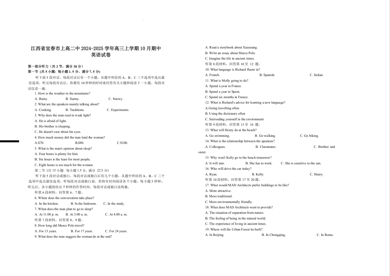 江西省宜春市上高二中2025届高三上学期10月期中考试 英语