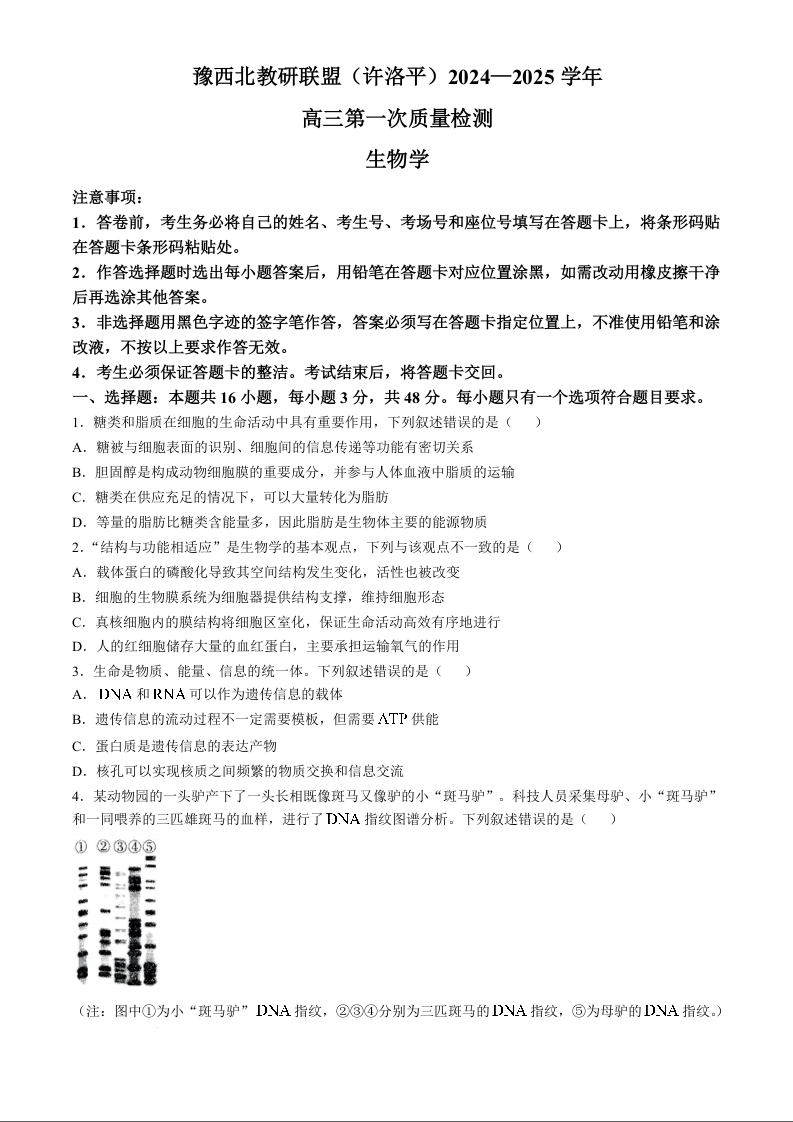 河南省豫西北教研联盟(许洛平)2025届高三上学期第一次质量检测 生物