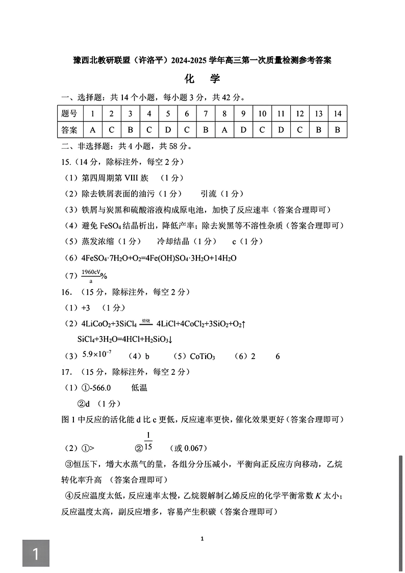 河南省豫西北教研联盟(许洛平)2025届高三上学期第一次质量检测 化学答案