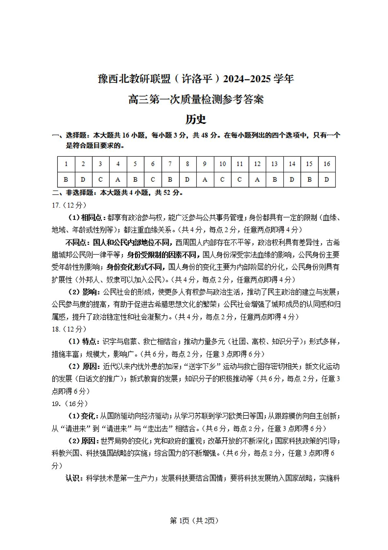 河南省豫西北教研联盟(许洛平)2025届高三上学期第一次质量检测 历史答案
