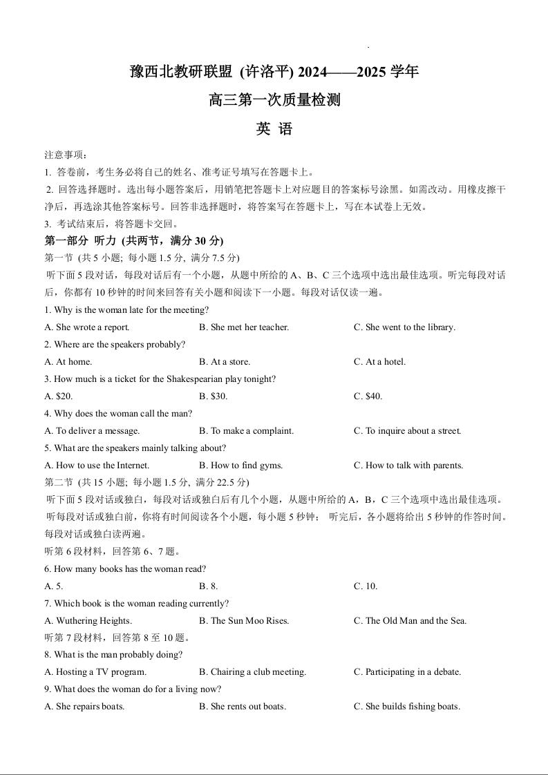 河南省豫西北教研联盟(许洛平)2025届高三上学期第一次质量检测 英语